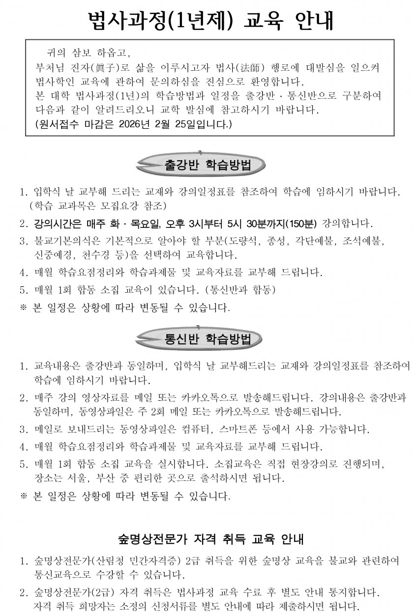법사과정 교육안내 페이지 정보 작성자 한국불교법사대학 댓글 0건 조회 472회 작성일 26-01-05 14:40 본문 목록 이전글법사과정 등록안내 26.01.05 다음글2026학년도 1월~2월 일정 25.12.29 댓글목록 댓글목록 등록된 댓글이 없습니다.