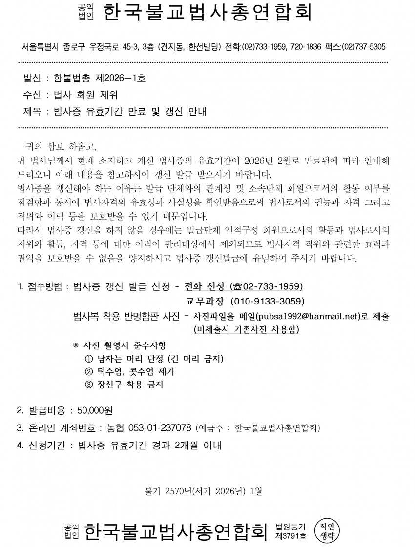 법사증 유효기간 만료 및 갱신 안내문 페이지 정보 작성자 한국불교법사대학 댓글 0건 조회 518회 작성일 26-01-23 11:03 본문 문의사항은 02-733-1959 연락주세요. 목록 이전글2026년 3월 일정 26.03.27 다음글법사과정 등록안내 26.01.05 댓글목록 댓글목록 등록된 댓글이 없습니다.